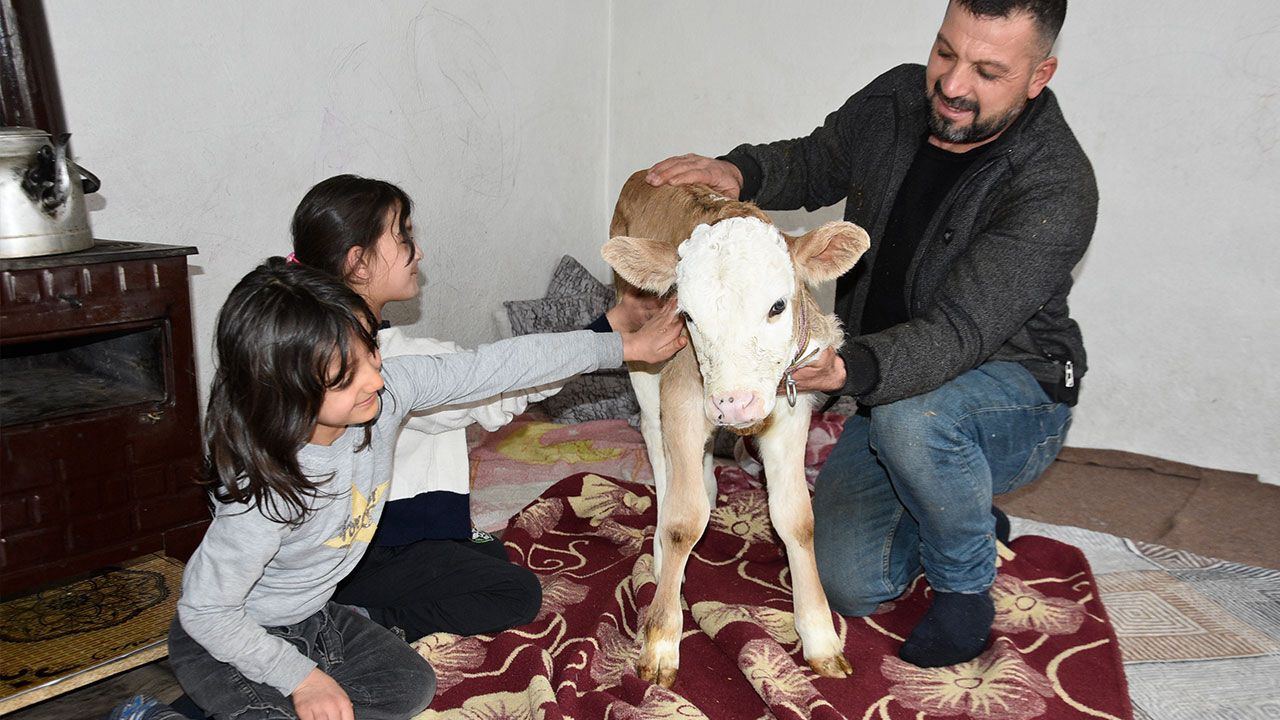 Tatvan ilçesi Yoncabaşı köyünde hayvancılıkla uğraşan Çetin Aygül, 4 gün önce dünyaya gelen buzağıyı sağlık durumunun iyi olmaması nedeniyle eve aldı. Henüz isim vermedikleri buzağı için sobanın yanında özel bir alan hazırlayan Aygül ailesi, yavrunun bakımını yaptı. Evin maskotu haline gelen buzağıya ailenin çocukları da ilgi gösteriyor. Ailenin kızı Nahidenur Aygül, buzağının tüylerini tarayıp çorap giydiriyor. Komşu çocuklar da eve gelip buzağıyı seviyor.
